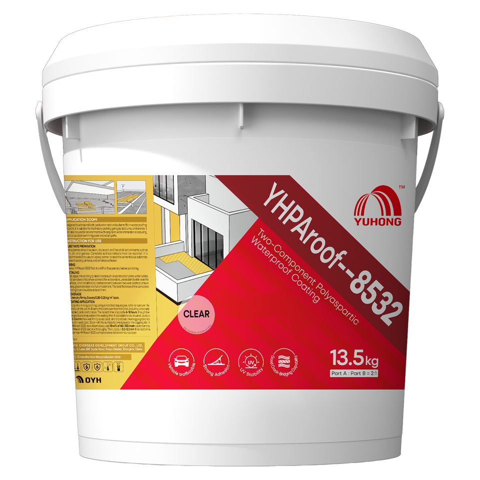 YHPAroof-8532 is a two-component, chemically cured, low-VOC, aliphatic polyaspartic polyurea waterproofing membrane designed for use as a pedestrian and vehicular traffic-bearing top coat. It can be applied alone or as a top layer over a high-performance aromatic polyurethane base coat, such as YHPUcoat-8200/8400.